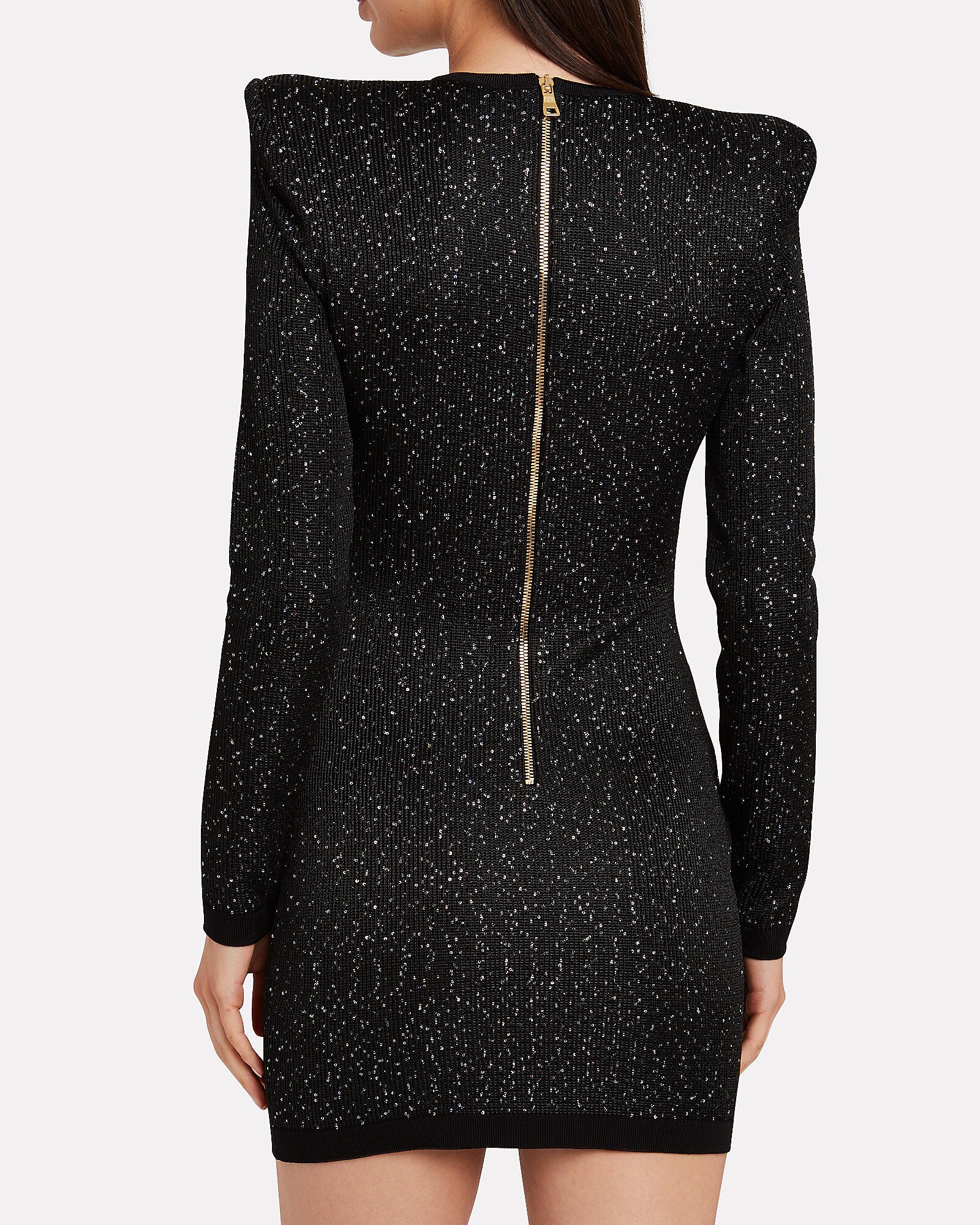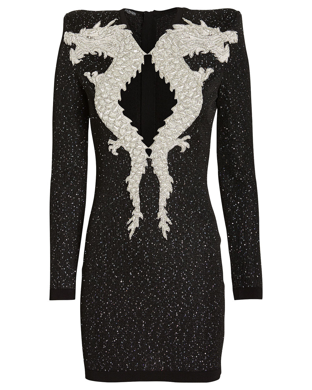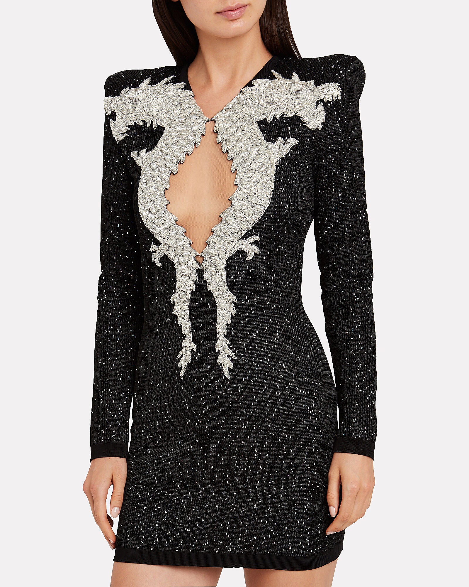 This Balmain mini dress presents a striking combination of sophistication and drama. Crafted from an embellished knit fabric, it features intricate silver dragon embroidery that frames a deep V-neckline. The long-sleeve, form-fitting silhouette is adorned with countless shimmering stones, making it an ideal statement piece for glamorous evening occasions.