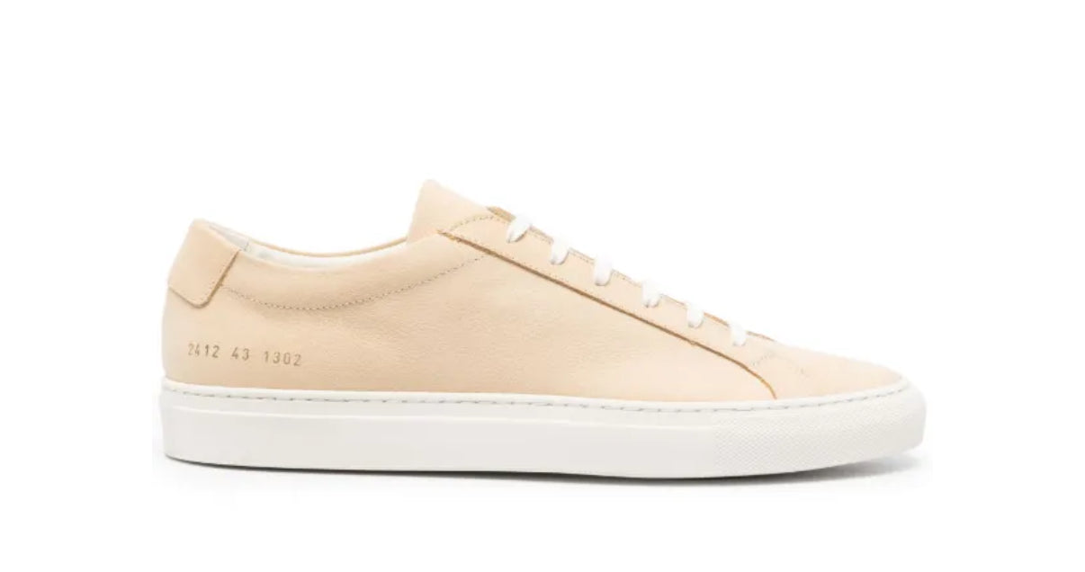 These Common Projects sneakers offer a refined take on the classic low-top silhouette, crafted from smooth nude leather. The design is characterized by its clean lines, white laces, and a durable white rubber sole. The brand’s signature series numbers are subtly stamped on the heel, perfect for elevated everyday wear.