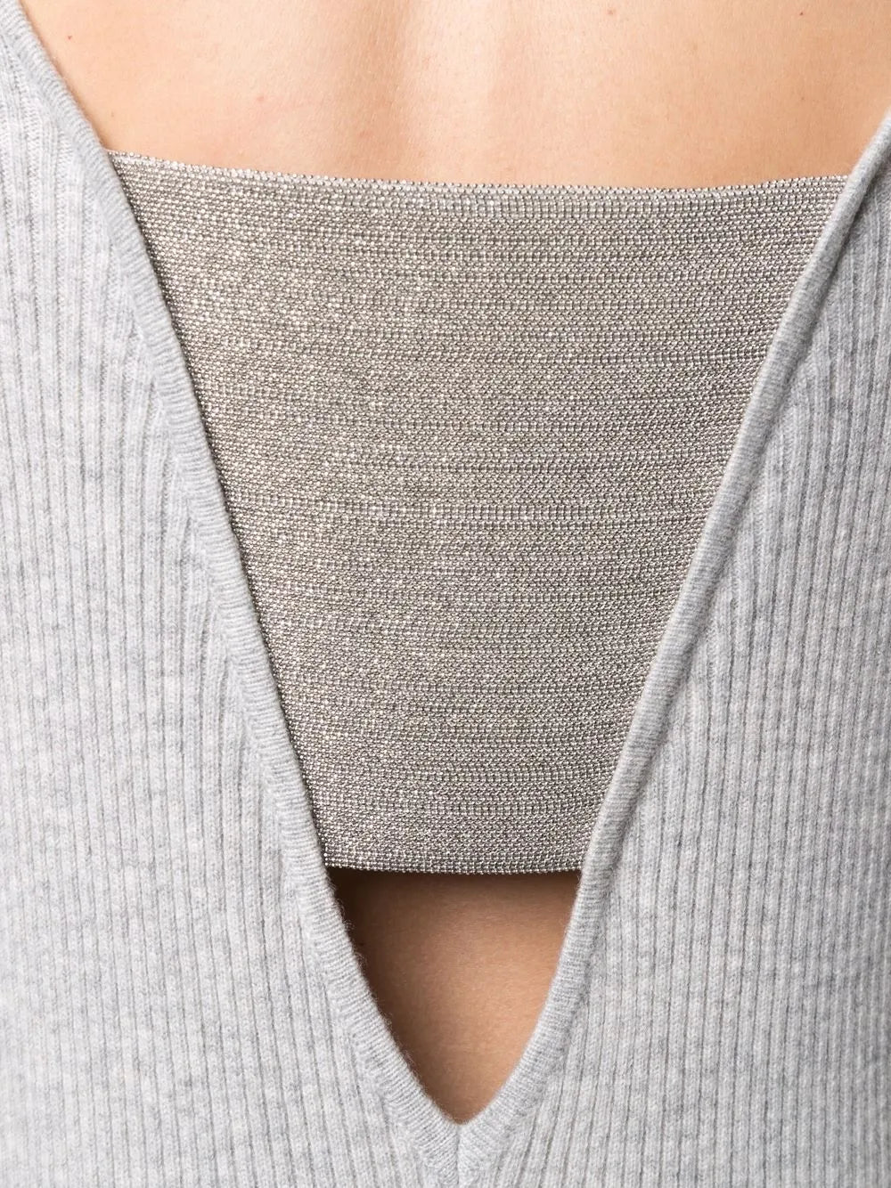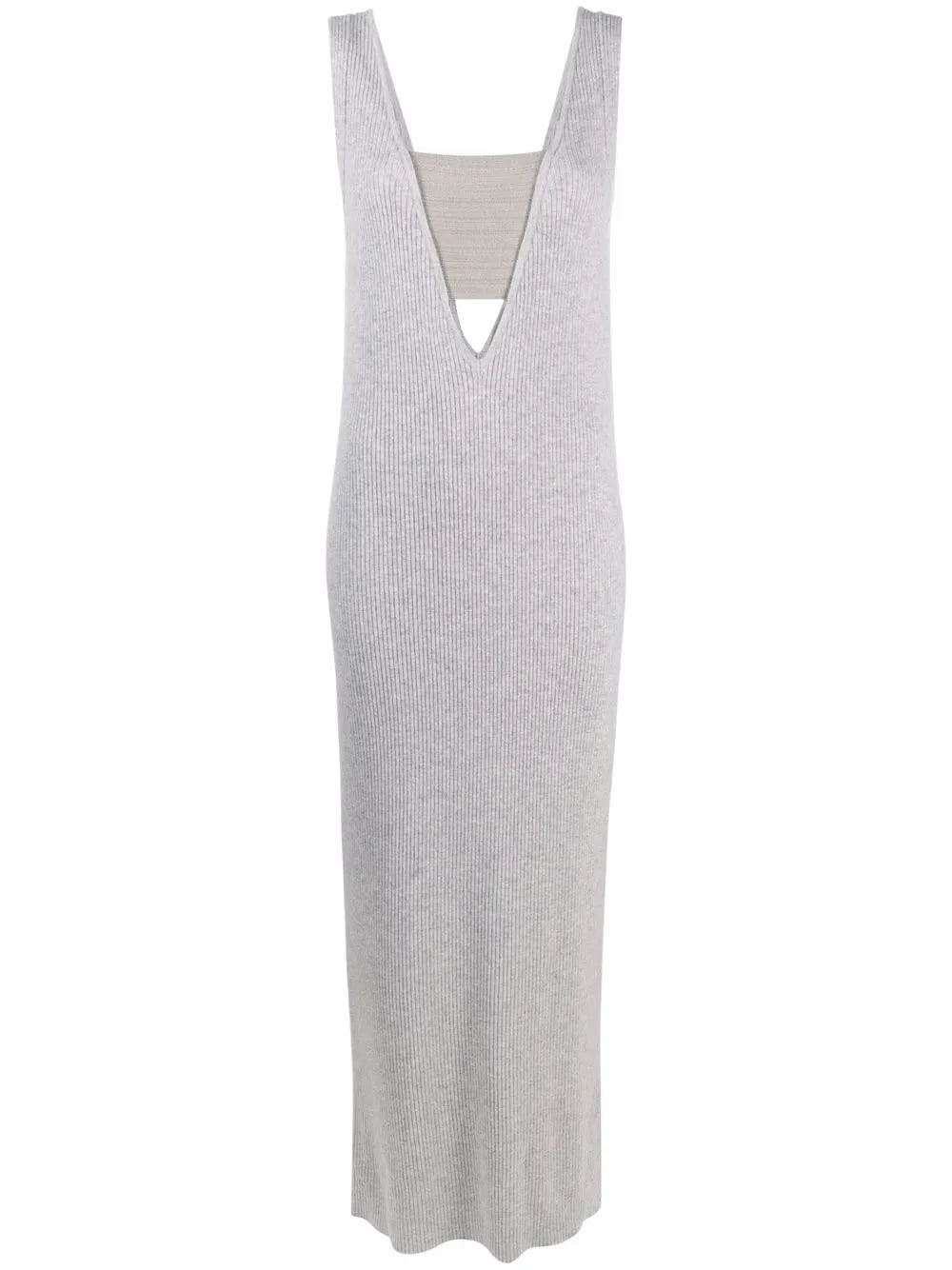 This sleeveless midi dress is crafted from a comfortable ribbed knit fabric, offering a contemporary and elegant look. It features a distinctive deep V-neckline complemented by a contrasting, lighter-toned band across the chest, adding a unique layered detail to its streamlined silhouette. Ideal for everyday wear or chic casual occasions.