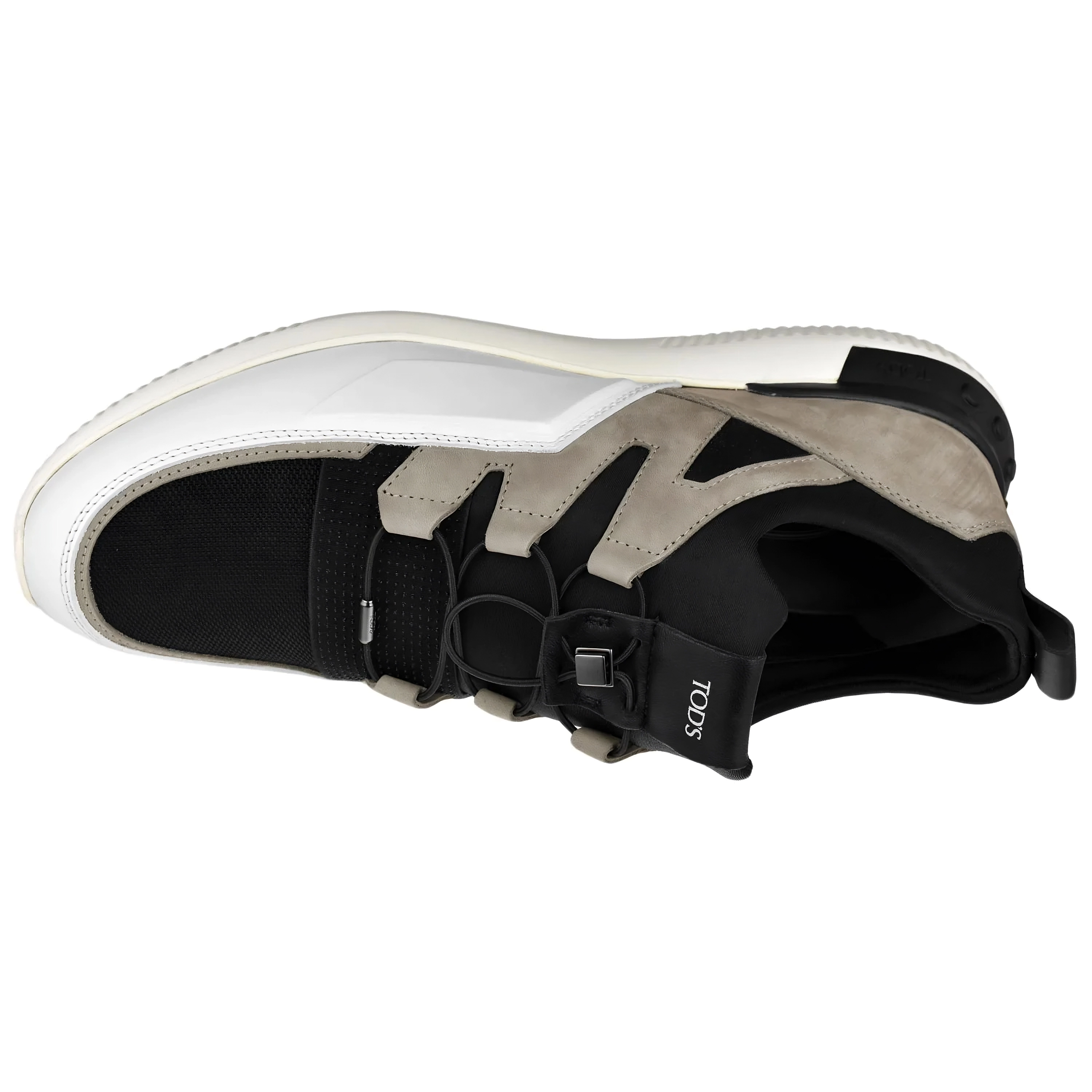 These low-top sneakers combine breathable mesh with smooth leather overlays, offering a contemporary athletic aesthetic. They feature an innovative elastic lacing system with a toggle closure for easy adjustment and a comfortable fit. The multi-textured design in black, grey, and white makes them suitable for everyday casual wear.