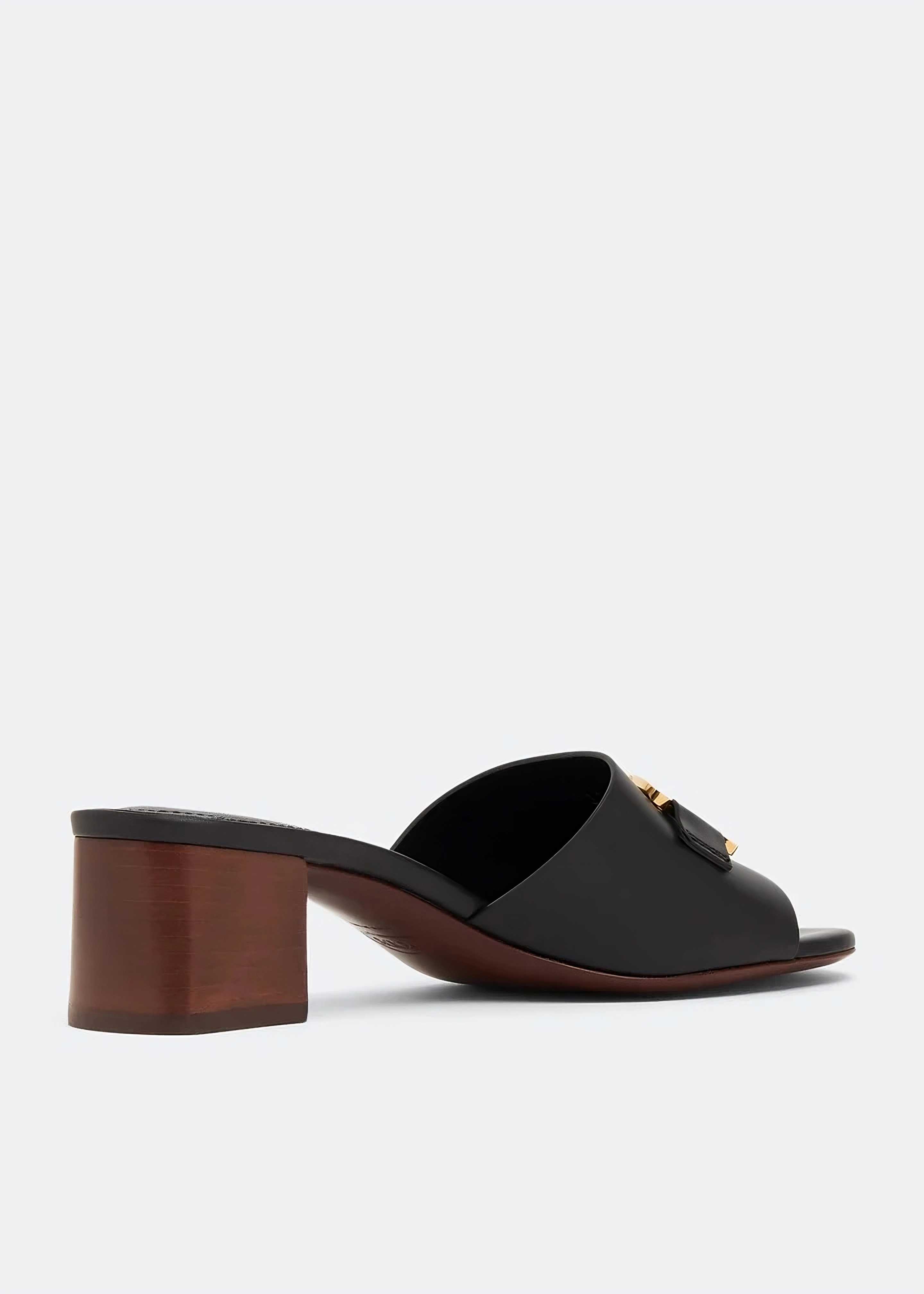 These Tod's heeled mules offer a sophisticated, effortless style crafted from smooth black leather. They feature a distinctive gold-tone T-logo hardware on the strap and a comfortable block heel, making them ideal for elegant everyday wear or evening occasions.