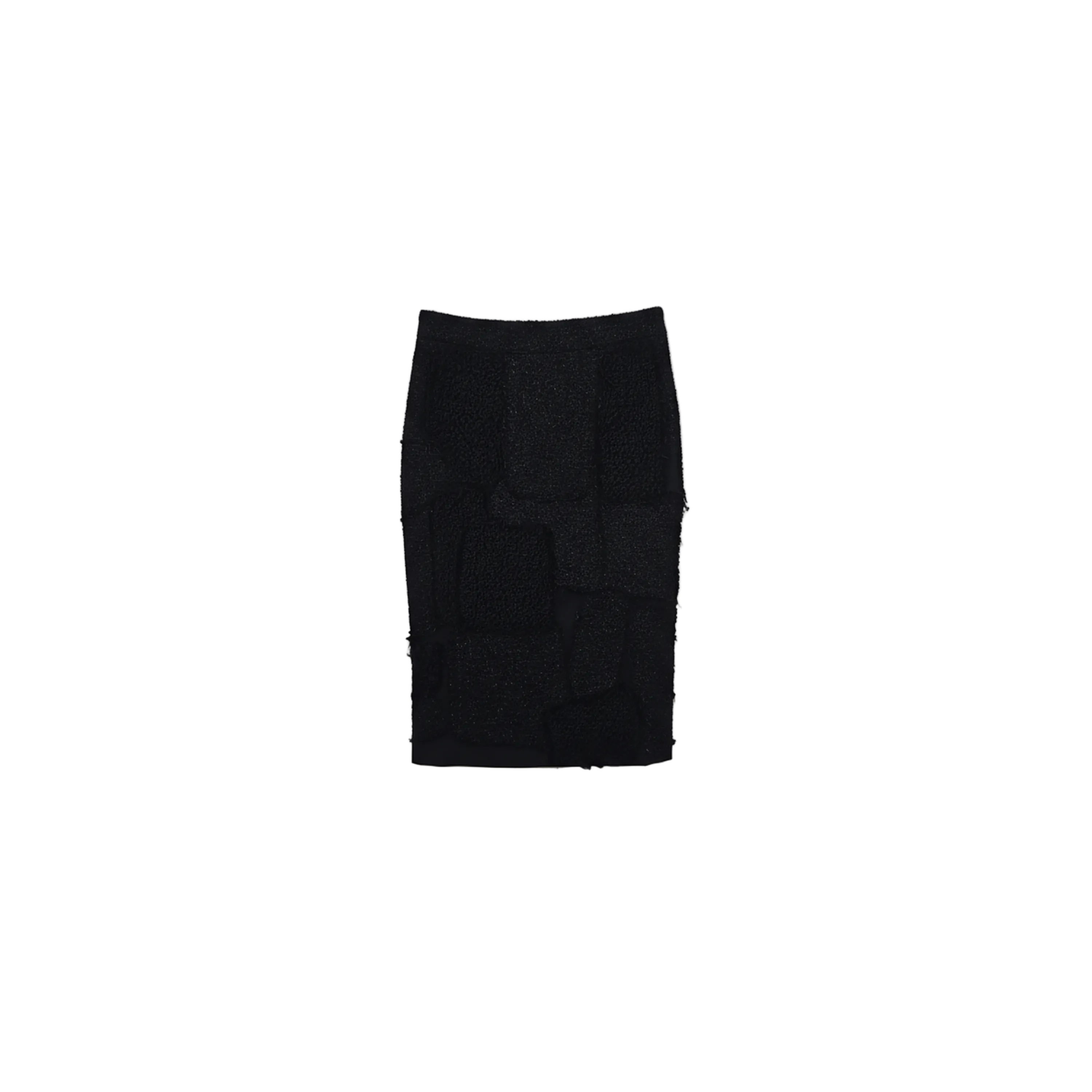 This straight-cut skirt is crafted from a heavily textured black fabric, giving it a unique tactile quality. It's detailed with a distinctive double-breasted button front and finished with frayed edges for a modern, deconstructed feel.