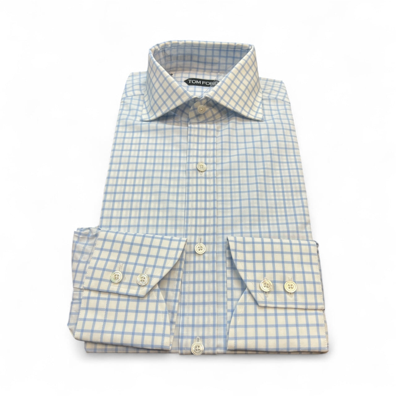 Expertly crafted by Tom Ford, this shirt is the perfect addition to any man's wardrobe. Made from high-quality materials and featuring a classic white and light blue checkered pattern, this shirt exudes sophistication and style. With its tailored fit and luxurious feel, it's the perfect choice for any occasion.