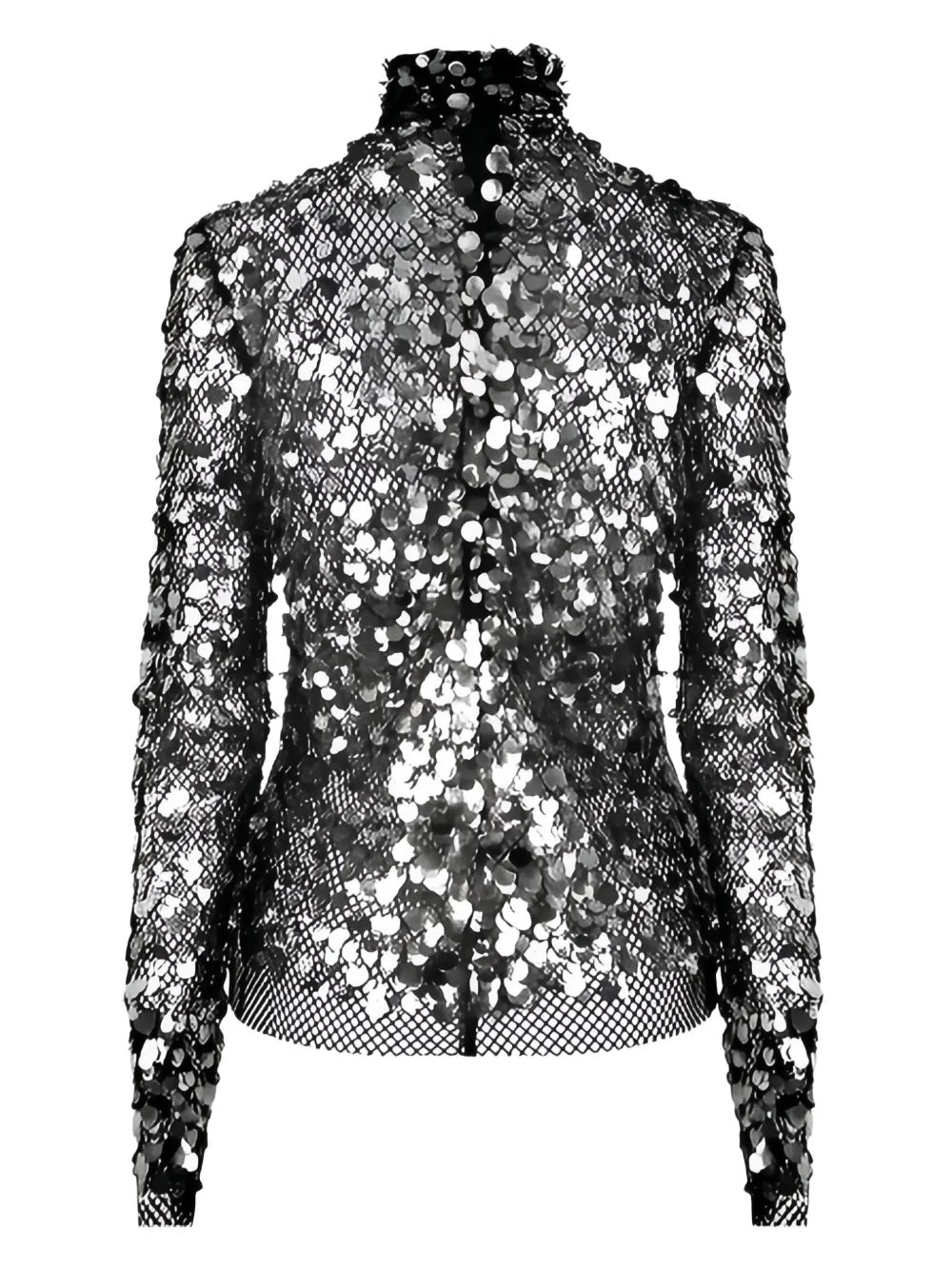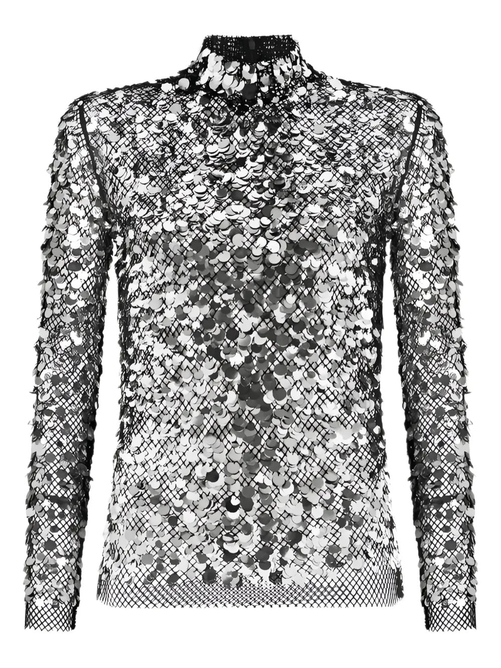 This captivating blouse presents a shimmering design with its all-over sequin embellishment, creating a luxurious aesthetic. Crafted from a delicate mesh fabric, it features a high neckline and long sleeves, offering a sophisticated silhouette ideal for evening wear.
