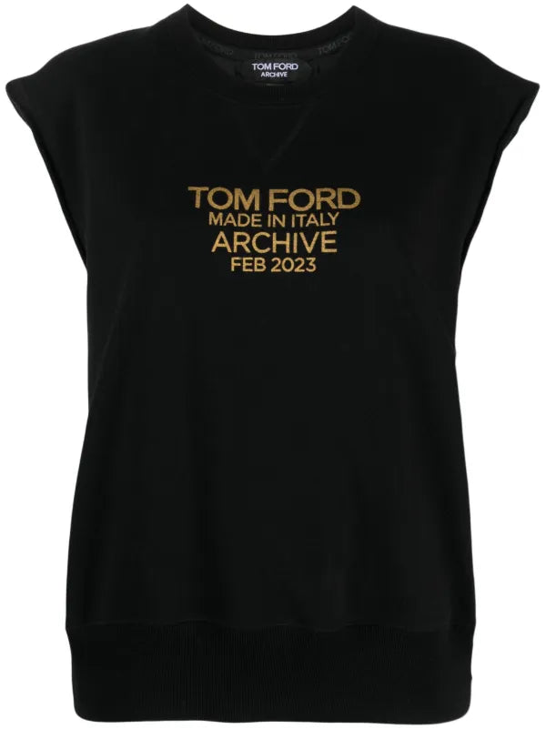This sleek sleeveless sweatshirt is crafted from black cotton, designed for a modern and relaxed fit. It features a striking gold 'TOM FORD ARCHIVE FEB 2023' logo print on the chest, complemented by a classic ribbed crew neck and hem for a polished finish.
