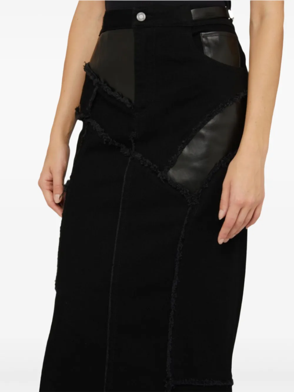 This Tom Ford skirt presents a distinctive silhouette crafted from a striking combination of black denim and luxurious leather panels. Its contemporary patchwork design is accentuated by prominent frayed seams, offering a raw yet refined aesthetic suitable for a modern everyday look.