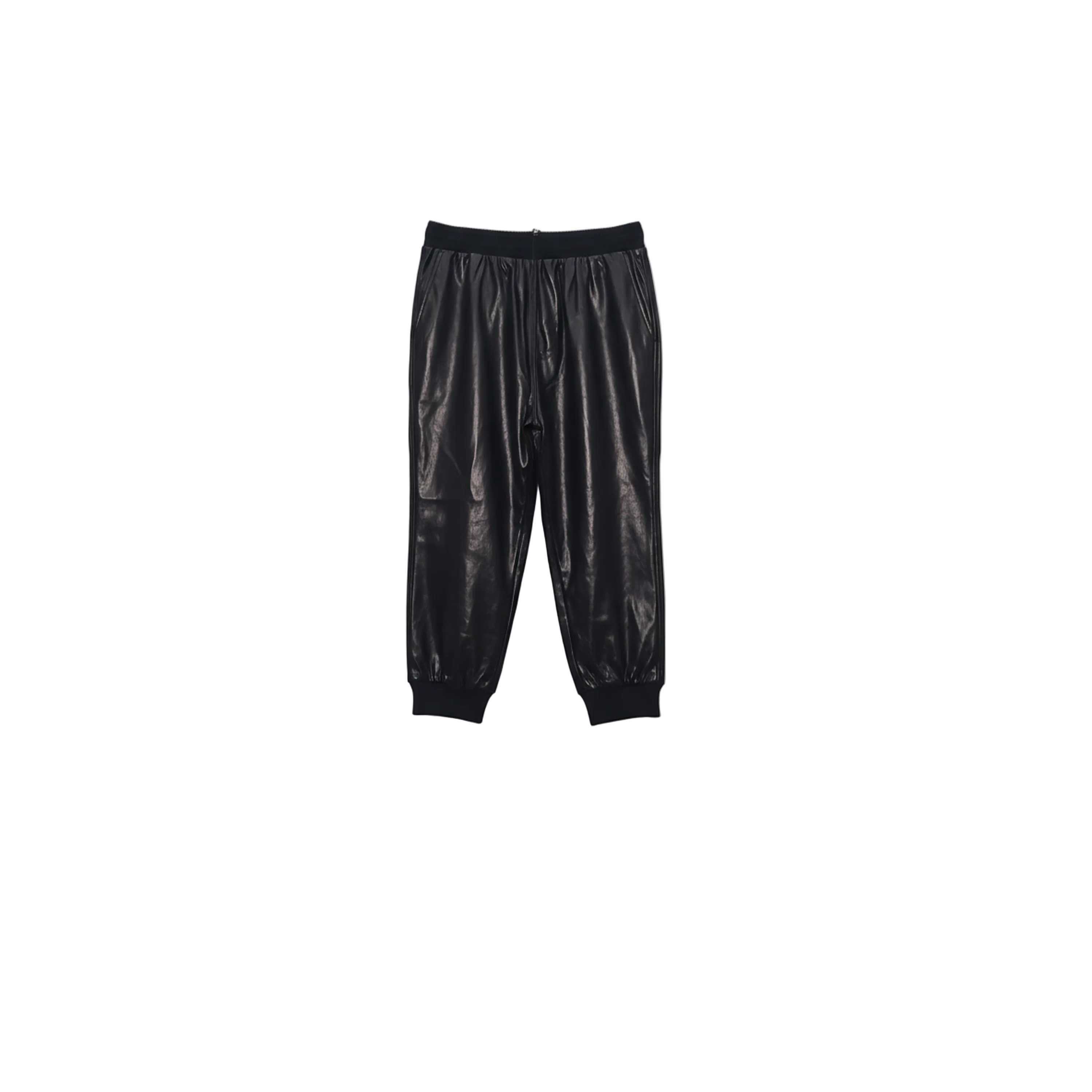 These luxurious jogger pants are crafted from supple black leather, offering a refined take on a casual silhouette. They feature a comfortable ribbed elastic waistband and cuffs, complemented by subtle track-style stripes down the side seams. This piece offers a relaxed fit, perfect for an elevated casual or streetwear look.