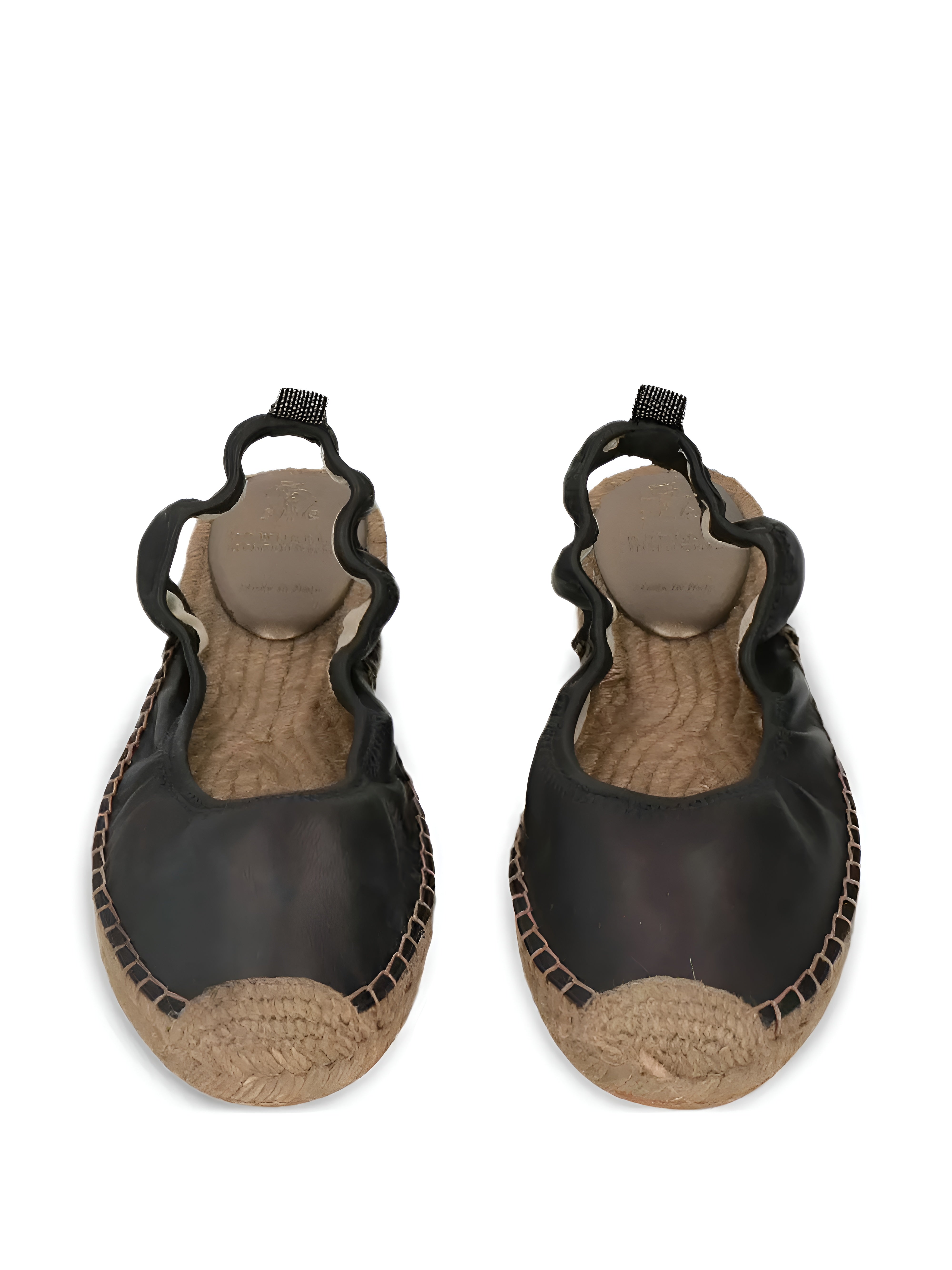 These Brunello Cucinelli espadrille flats offer a refined blend of comfort and style, crafted from soft black leather. They feature a distinctive ruched slingback strap and a classic braided jute sole, making them an ideal choice for elevated casual wear.