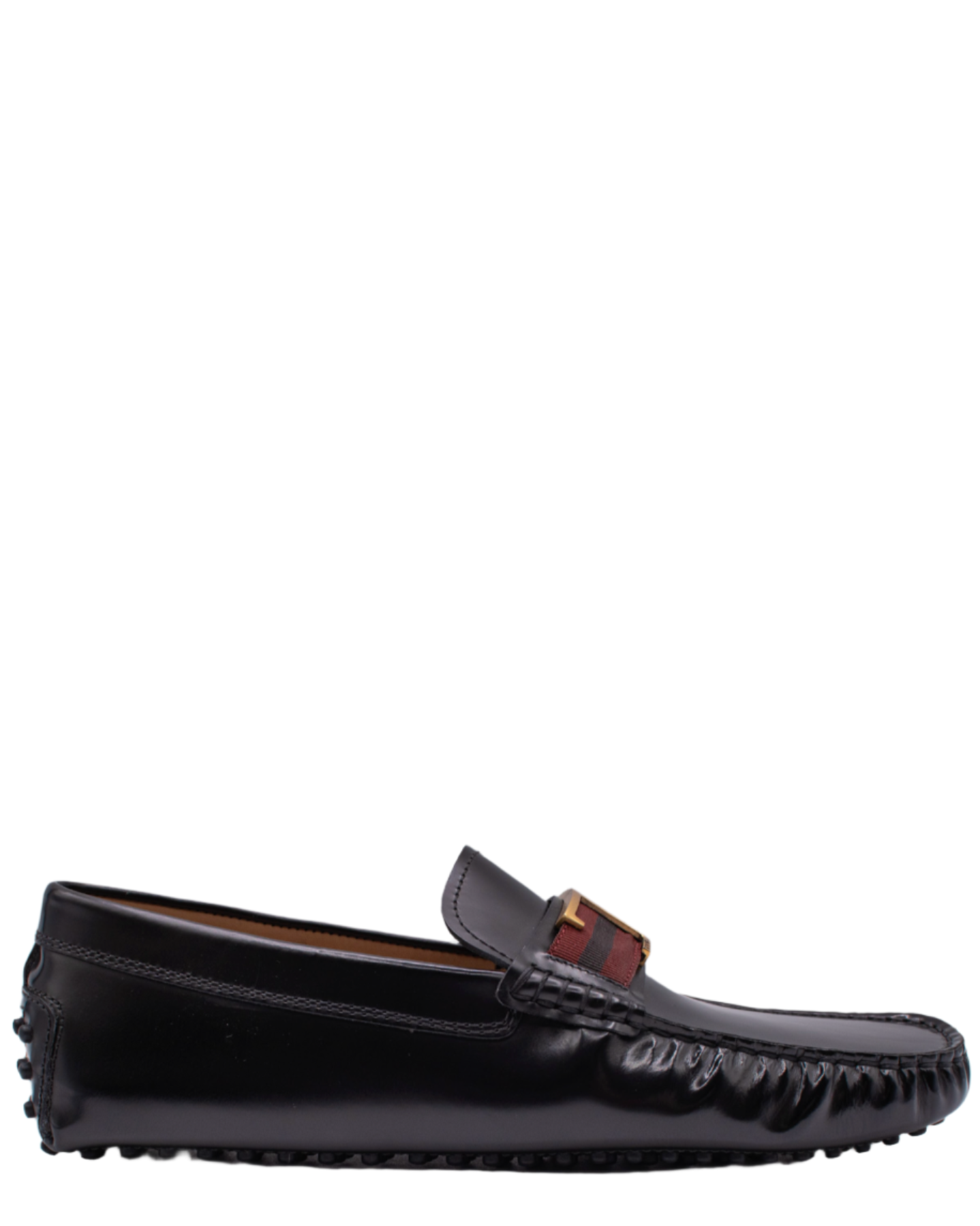 These refined driving shoes are meticulously crafted from smooth black leather, offering a polished yet relaxed appeal. They feature a distinctive striped strap detail on the vamp, complemented by a subtle gold-tone buckle and traditional moccasin stitching. The signature gommino sole ensures superior grip and comfort.